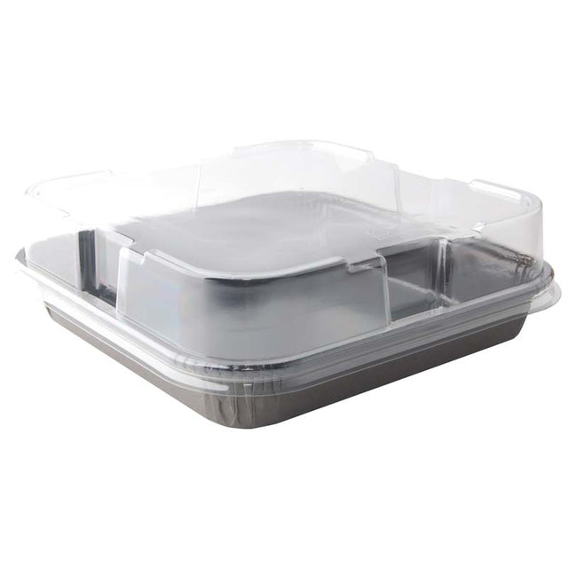 Streamline baking, serving, and display with the 8" x 8" Ovenable Black Solid Board Rolled Rim Tray paired with a Clear PET Dome Lid. Made from durable, domestically produced solid board, this tray is an eco-friendly alternative to metal or plastic pans, perfect for brownies, cakes, quiches, cobblers, and other baked goods. Oven- and microwave-safe, it can go from freezer to oven to table, while the extruded polymer coating creates a moisture- and grease-resistant barrier for easy release and professional presentation. Stackable, recyclable, and disposable, it saves time, reduces cleanup, and supports efficient operations.