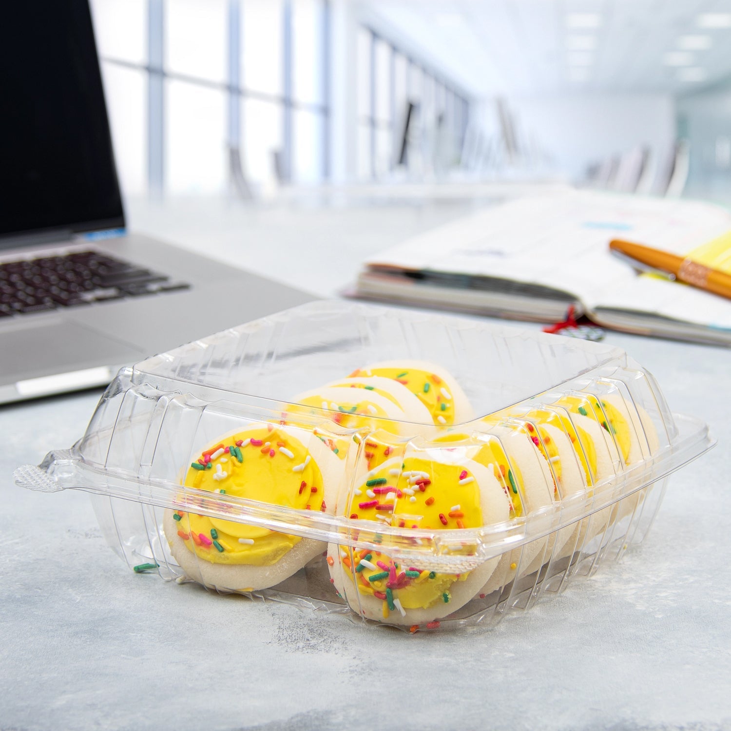 Keep your food fresh, visible, and secure with the 8-inch Medium Clear PET Plastic Hinged Container. Crafted from high-quality, durable PET plastic, this container is perfect for showcasing deli meals, baked goods, salads, and desserts. The crystal-clear design enhances product presentation, while the leak-resistant seal prevents spills during transport or storage. Ideal for restaurants, bakeries, cafeterias, and catering services, this hinged-lid container delivers efficiency with an audible snap closure, ensuring freshness and security. Its stackable design saves space in busy kitchens, and its freezer-safe construction makes it perfect for both cold storage and display.
